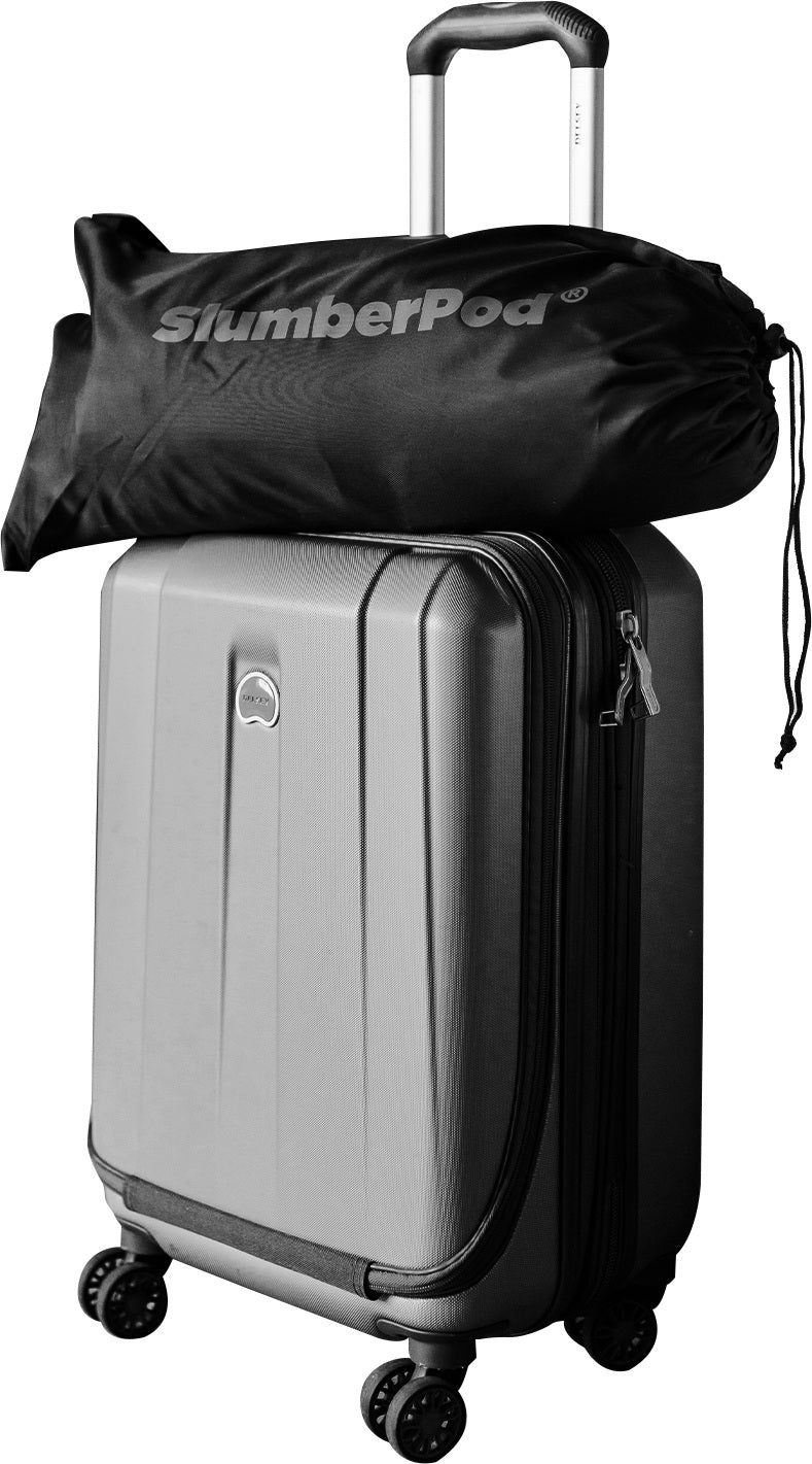 SlumberPod's designed "suitcase" box includes the premium fabric canopy, a set of two poles, and a fabric carry bag with shoulder strap (with instructions sewn in for convenience).